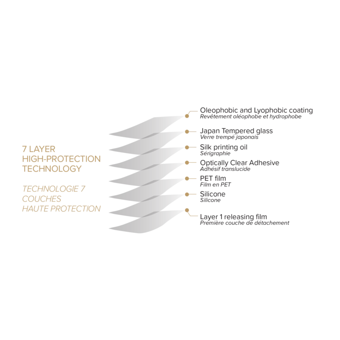 La couche supérieure a reçu un revêtement doux qui protège contre les particules de poussière, le dépôt des empreintes digitales et qui dispose également de propriétés anti-reflet, de façon à réduire l’éblouissement. Ce verre courbe 2,5D offre une dureté de 9H grâce à des matériaux vitrés robustes et une technologie révolutionnaire de haute protection à 7 couches.